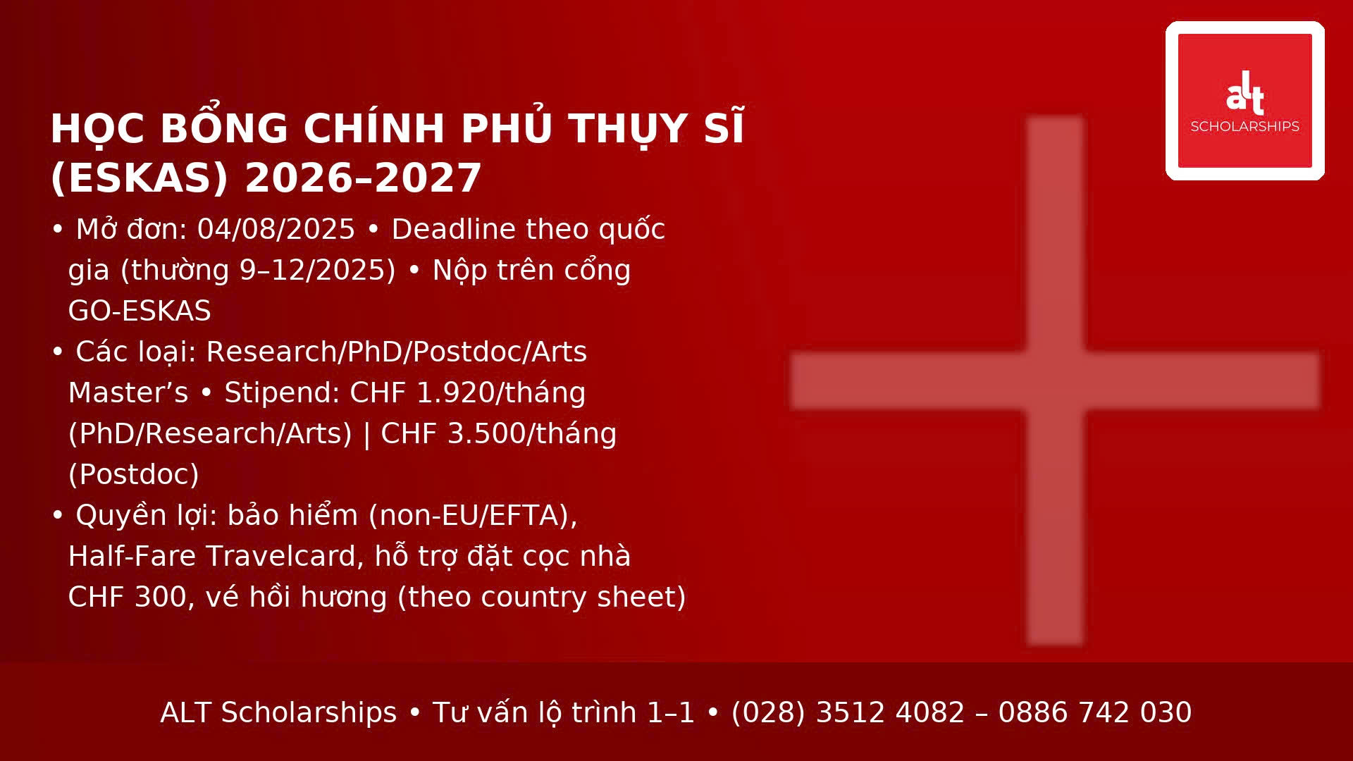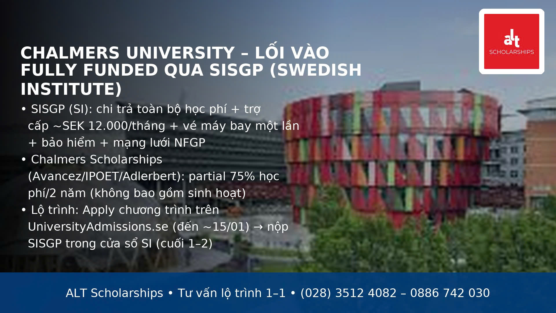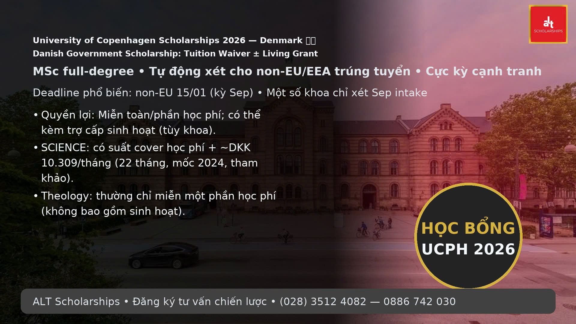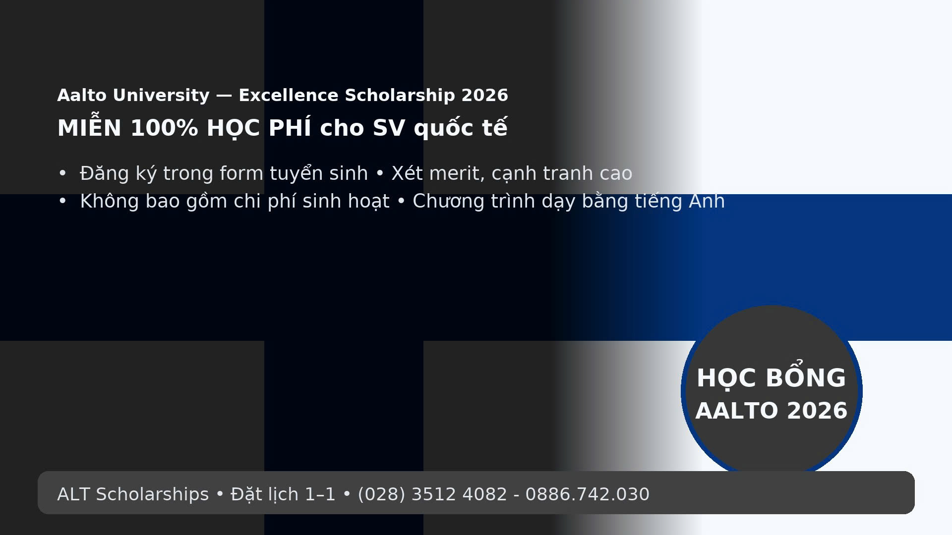 Miễn toàn/phần học phí ± trợ cấp sinh hoạt • Tự động xét cho ứng viên non-EU/EEA khi trúng tuyển • Cạnh tranh cao