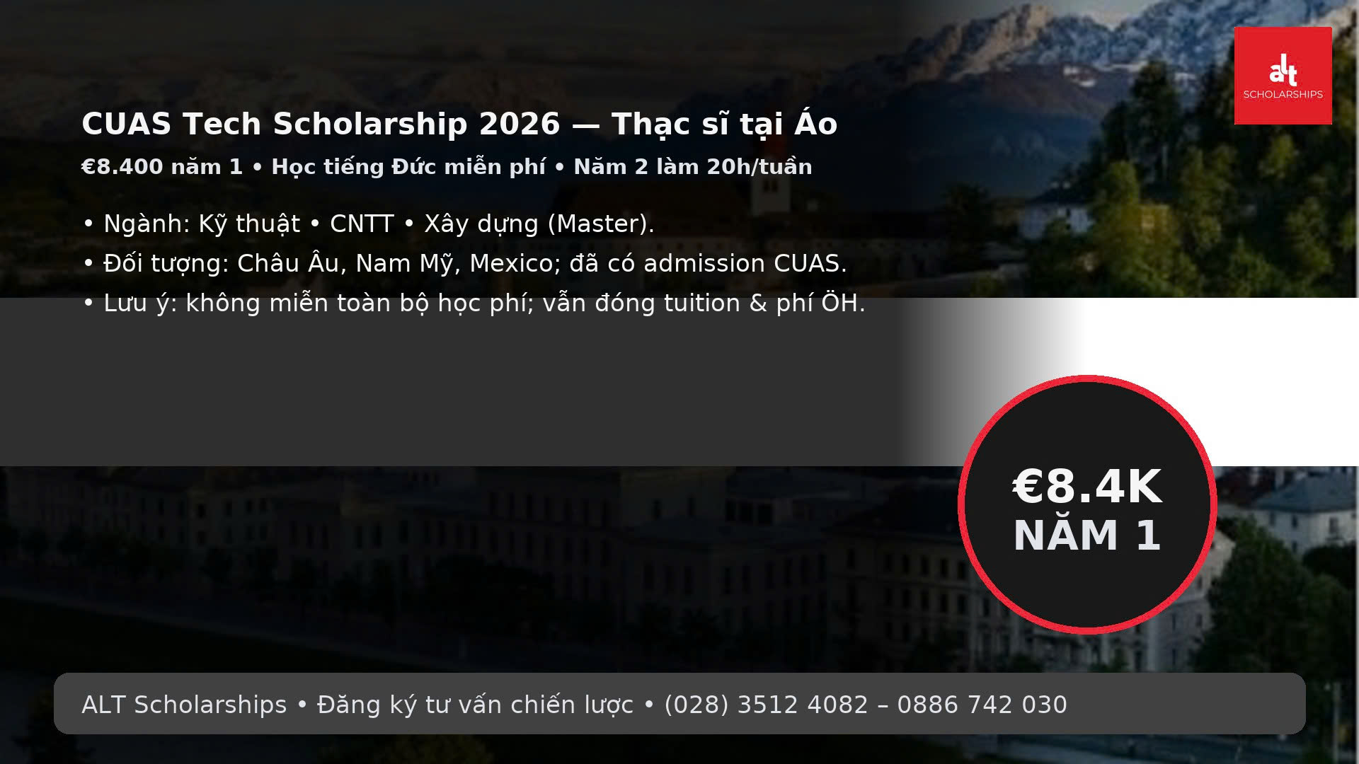 CUAS – Carinthia University of Applied Sciences (FH Kärnten) mở học bổng TECH Scholarship nhằm thu hút ứng viên xuất sắc từ Châu Âu, Nam Mỹ và Mexico theo học thạc sĩ các ngành kỹ thuật, CNTT và kỹ thuật xây dựng tại bang Carinthia (Áo). Học bổng cung cấp €8.400 cho năm học đầu, khóa tiếng Đức miễn phí, và cơ hội làm thêm 20h/tuần ở năm 2 thông qua mạng lưới doanh nghiệp – phòng lab của trường.