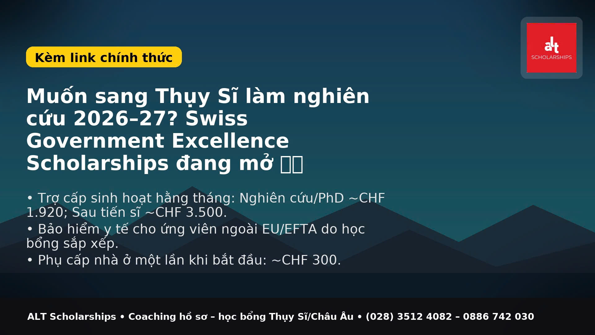 Học bổng Swiss Government Excellence Scholarships hỗ trợ nghiên cứu sinh quốc tế và, ở một số quốc gia, ứng viên lĩnh vực nghệ thuật. Chương trình do Ủy ban Liên bang về Học bổng cho Sinh viên Nước ngoài (FCS) vận hành và Cơ quan Liên bang về Giáo dục, Nghiên cứu và Đổi mới (SERI) điều phối. Mỗi năm, chương trình mở theo từng quốc gia, với hạn nộp và yêu cầu riêng.