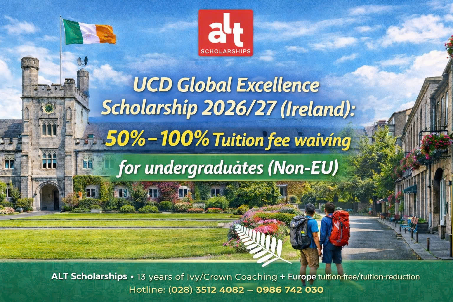 Nếu bạn/gia đình đang cân nhắc Ireland như một “điểm đến châu Âu nói tiếng Anh” nhưng lo học phí, UCD Global Excellence là học bổng đáng để nhắm: miễn 50% hoặc 100% học phí, áp dụng trong suốt thời gian học (nếu duy trì điều kiện). Bài này giúp phụ huynh và học sinh Việt Nam hiểu rõ điều kiện – deadline – cách nộp, và có timeline đếm lùi để chuẩn bị đúng nhịp.