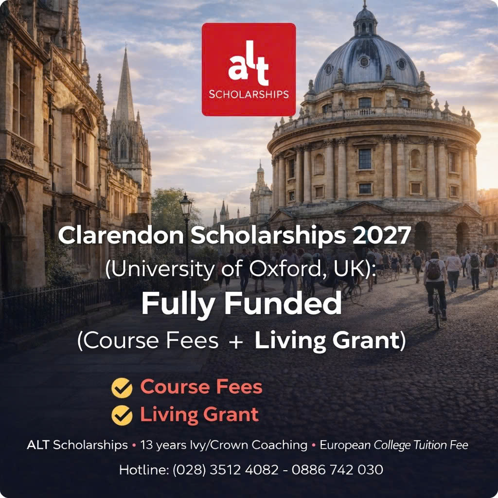 Clarendon Scholarships của University of Oxford: cover toàn bộ course fees và có grant sinh hoạt hằng năm; quan trọng nhất là không có đơn học bổng riêng—bạn chỉ cần nộp hồ sơ graduate Oxford đúng deadline tháng 12 hoặc tháng 01 của ngành.