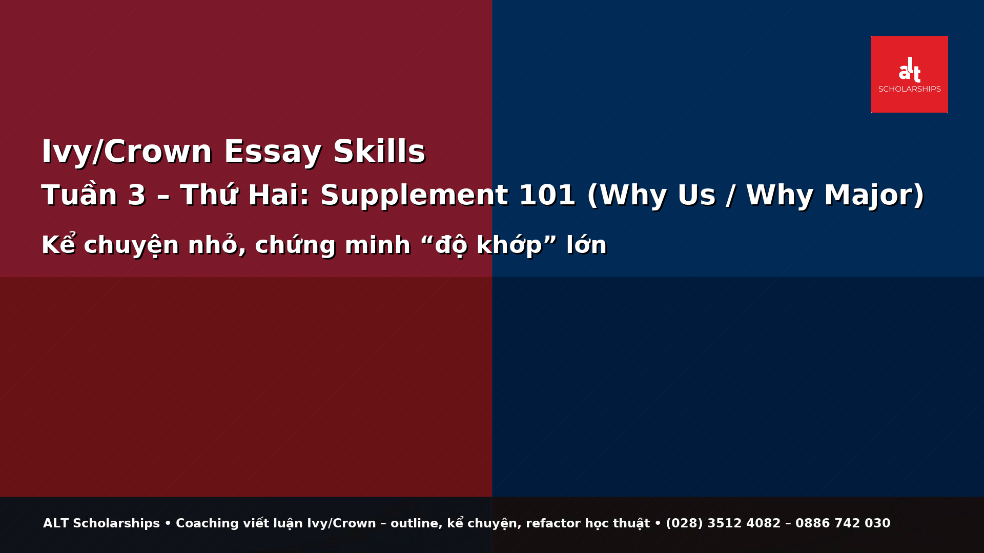 Chuỗi này giúp bạn xây kỹ năng viết luận theo từng bước: tìm “hạt” ý tưởng → chọn cấu trúc (Narrative/Montage; Type A–D) → viết nháp → sửa bài (macro → micro) → “thổi hồn” (hook, show–don’t–tell, F→N→A) → supplement essays/UC → đọc-hiểu bài mẫu → dùng bộ công cụ tổng kết. Mục tiêu: biến tính từ mơ hồ thành hành động + số liệu, tăng phản tư và độ khớp với ngành/trường. Tìm lại các phần trước theo tag #IvyCrownEssaySkills #CollegeEssay.