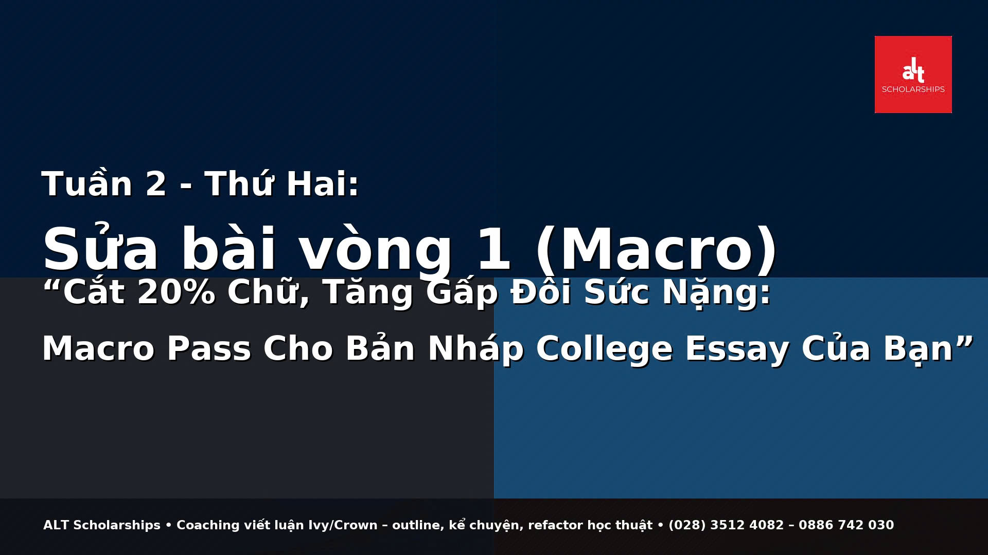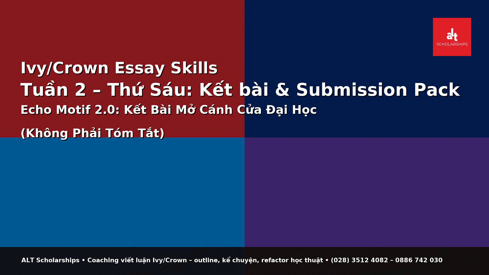Chuỗi này giúp bạn xây kỹ năng viết luận theo từng bước: tìm “hạt” ý tưởng → chọn cấu trúc (Narrative/Montage; Type A–D) → viết nháp → sửa bài (macro → micro) → “thổi hồn” (hook, show–don’t–tell, F→N→A) → supplements/UC → đọc-hiểu bài mẫu → dùng bộ công cụ tổng kết. Mục tiêu: biến tính từ mơ hồ thành hành động + số liệu, tăng phản tư và độ khớp ngành/trường. Tìm lại các phần trước theo tag #IvyCrownEssaySkills #CollegeEssay. (Tài liệu tặng ở cuối bài.)