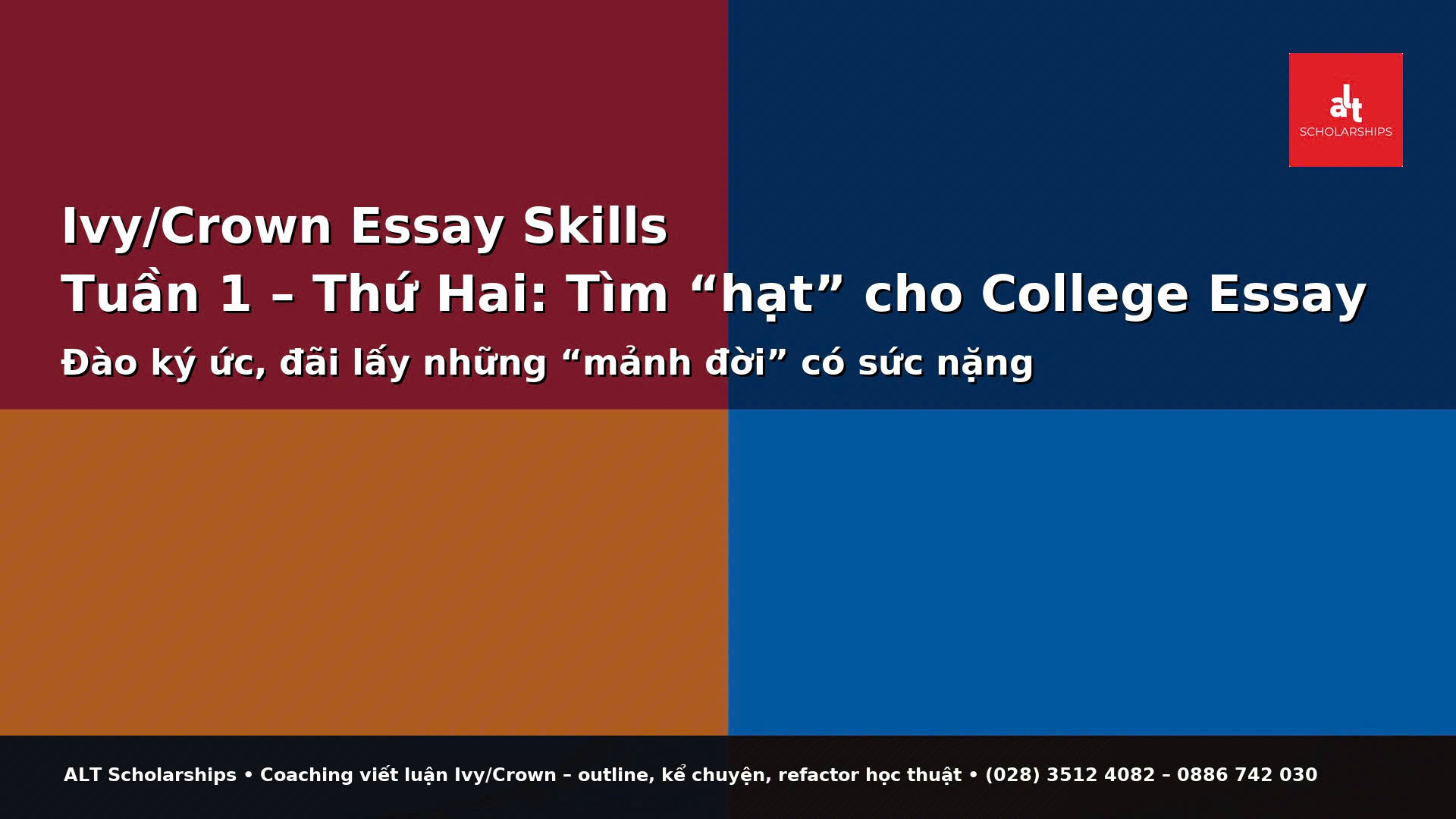 Chuỗi này giúp bạn xây kỹ năng viết luận theo từng bước: tìm “hạt” ý tưởng → chọn cấu trúc (Narrative/Montage; Type A–D) → viết nháp → sửa bài (macro → micro) → “thổi hồn” (hook, show–don’t–tell, F→N→A) → supplements/UC → đọc-hiểu bài mẫu → dùng bộ công cụ tổng kết. Mục tiêu: biến tính từ mơ hồ thành hành động + số liệu, tăng phản tư và độ khớp với ngành/trường. Tìm lại các phần trước theo tag #IvyCrownEssaySkills #CollegeEssay. (Tài liệu tặng ở cuối bài.)