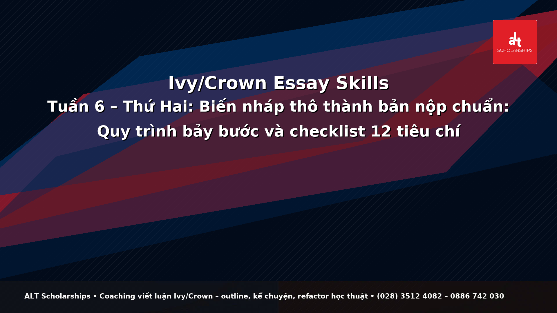 Chuỗi này giúp bạn xây kỹ năng viết luận theo từng bước: tìm “hạt” → chọn cấu trúc (Story/Montage) → viết nháp → sửa (macro→micro) → “thổi hồn” (hook, show–don’t–tell, F→N→A) → supplements/UC → đọc mẫu → dùng checklist. Mục tiêu: kết bài có lực, mở hướng học thuật rõ và nộp gói hồ sơ sạch, đúng chuẩn.